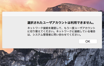 先日、自宅に置いてあるMacをVNC(画面共有)で操作しようとしたところ、以下のような表示が出て、接続はできていたものの、ログインできず、エラー画面から進むことができませんでした。 選択されたユーザーアカウントは利用でき…